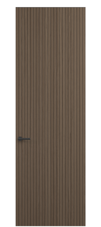 SELECT — коллекция минималистичных дверей с фрезеровкой по натуральному шпону. Рельеф на поверхности полотна создаёт игру света и тени, добавляя пространству динамичности и визуального объёма. Двери SELECT в сочетании со стеновыми панелями и мебельными фасадами, повторяющими лаконичный дизайн, создают единое стилевое решение.
