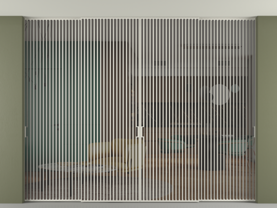 Дополнительно на раздвижную двустворчатую перегородку вдоль стены и четырёхстворчатую перегородку внутри проёма с двумя неподвижным полотнами можно установить механизм синхронного открывания — при открывании одной створки, вторая открывается автоматически.